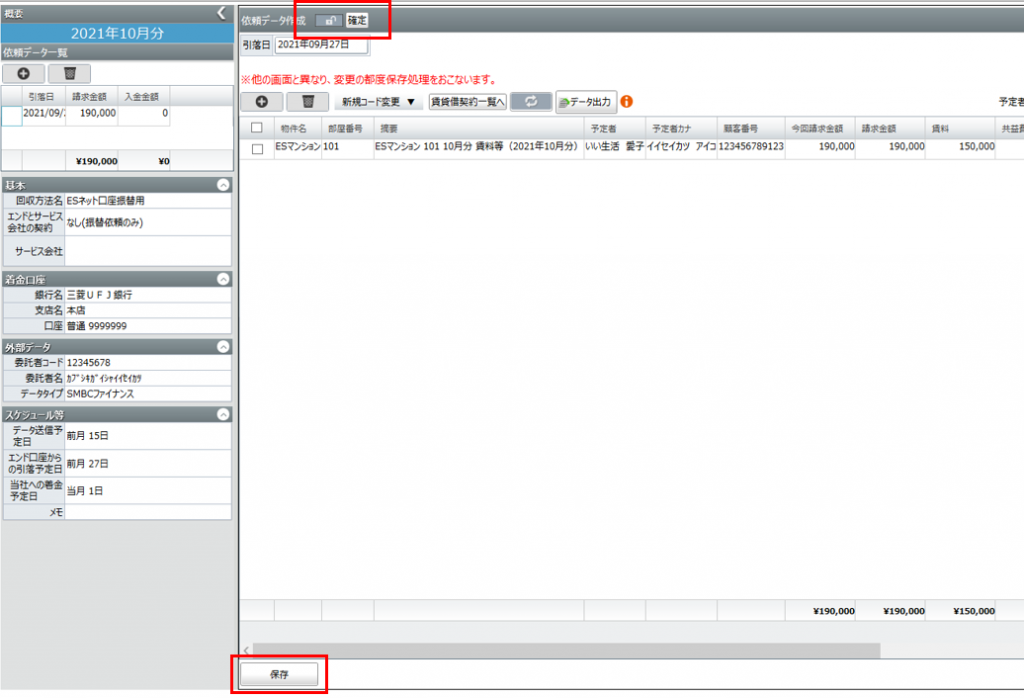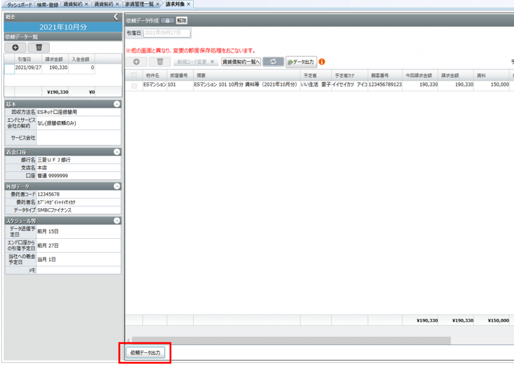 口座振替依頼をする顧客や物件情報、金額が一覧で表示されます。