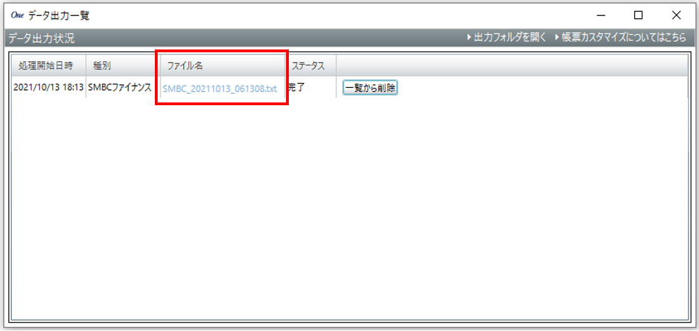 データ出力一覧のウィンドウが開くのでファイル名をクリックして振込依頼ファイルを出力します。