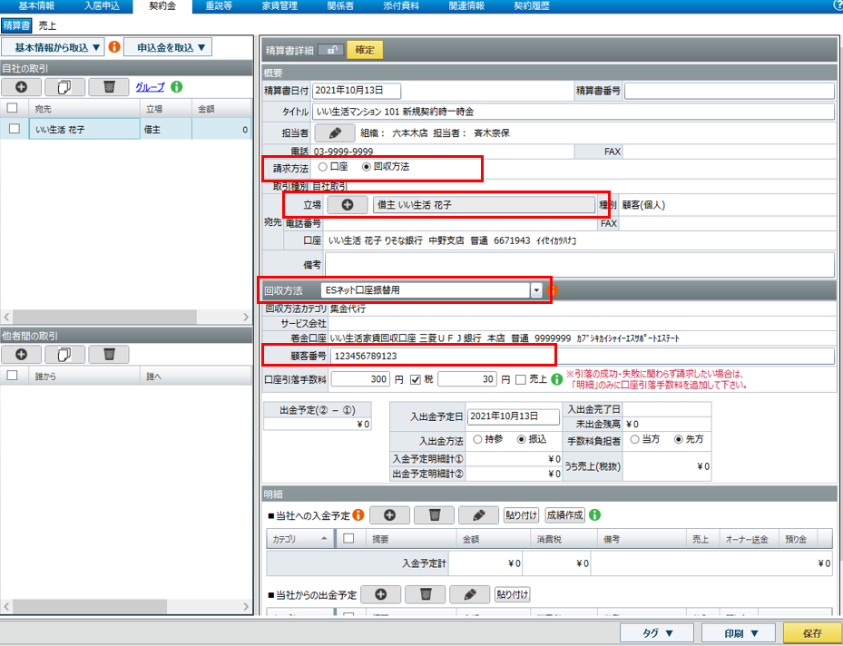 -回収方法:システム設定で登録したESネット口座振替用の家賃回収方法