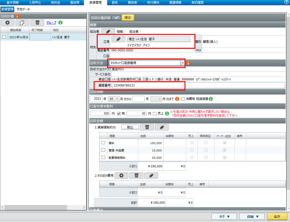 -回収方法 :システム設定で登録した『いい生活Pay 口座振替』用の家賃回収方法